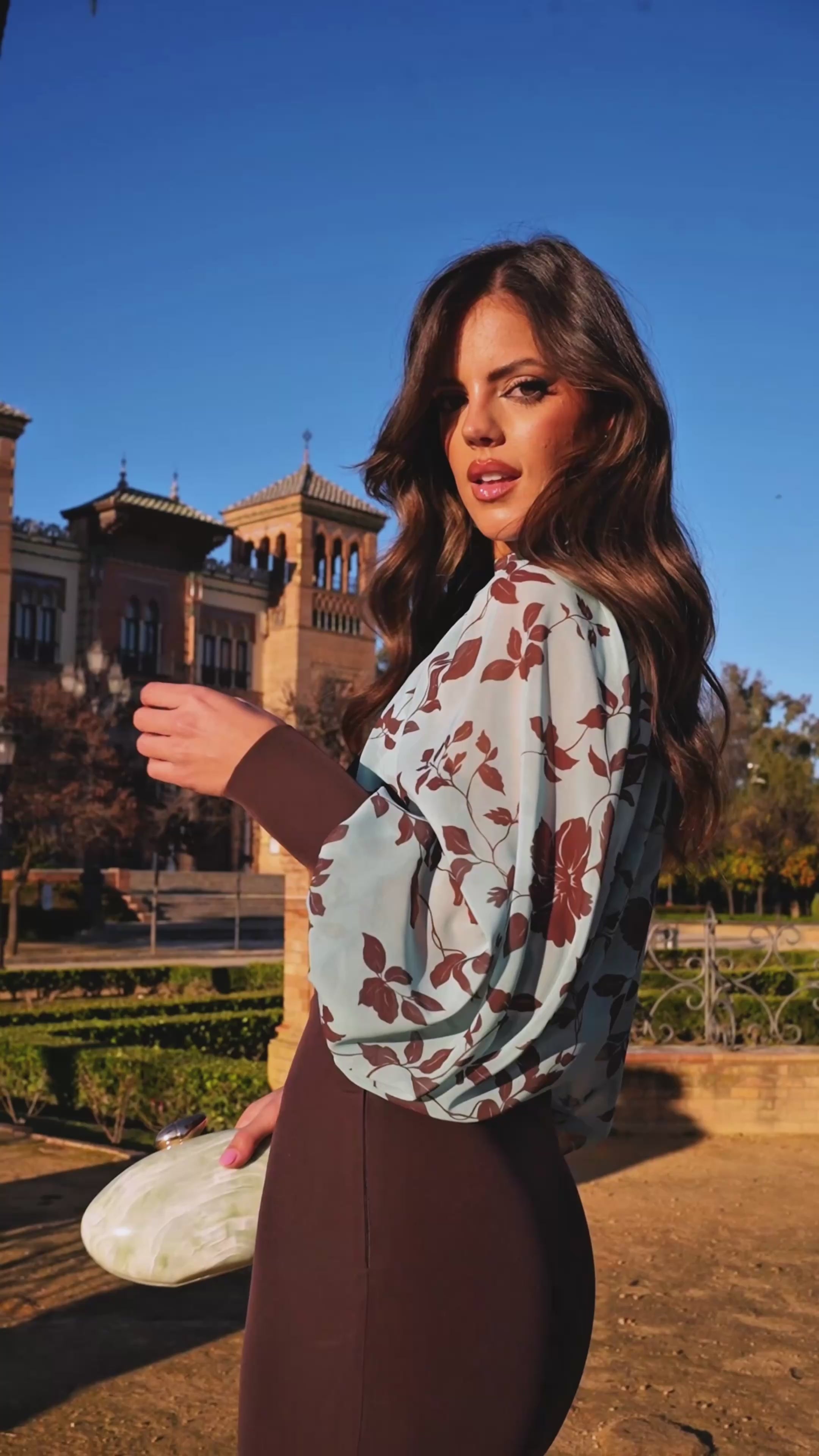 • Detalles de Diseño: El cuerpo del vestido en tono chocolate contrasta delicadamente con el azul empolvado y los motivos botánicos de la gasa.
