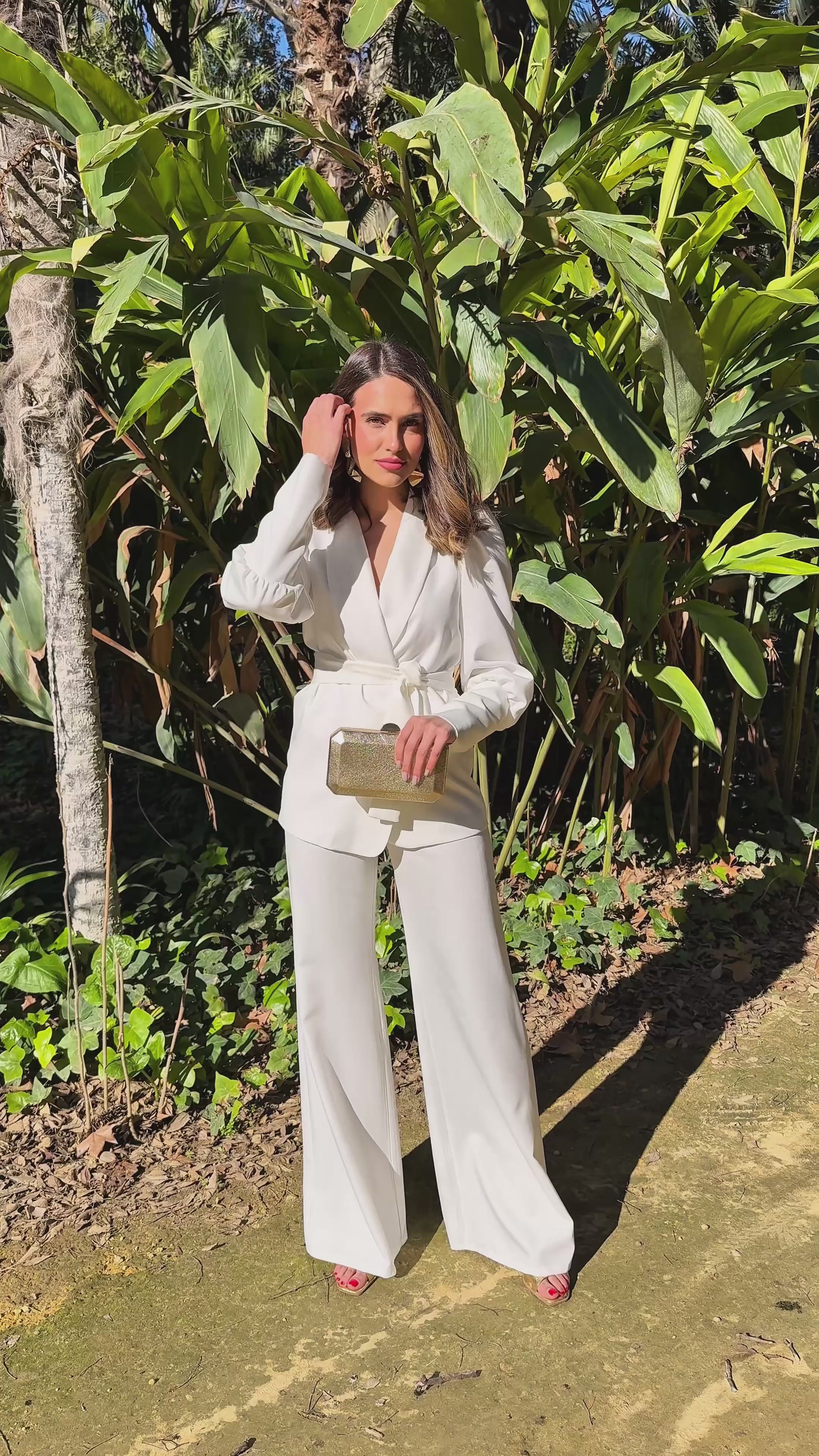 El diseño Azahar está confeccionado en crepe, compuesto por una chaqueta de corte estructurado, con escote en pico tipo blazer y cinturón del mismo tejido que realza la cintura, aportando feminidad y estilizando la figura. Las mangas ligeramente abullonadas añaden un toque actual y refinado. El pantalón, de tiro alto y pernera ancha, alarga visualmente las piernas y garantiza comodidad sin renunciar al estilo.
