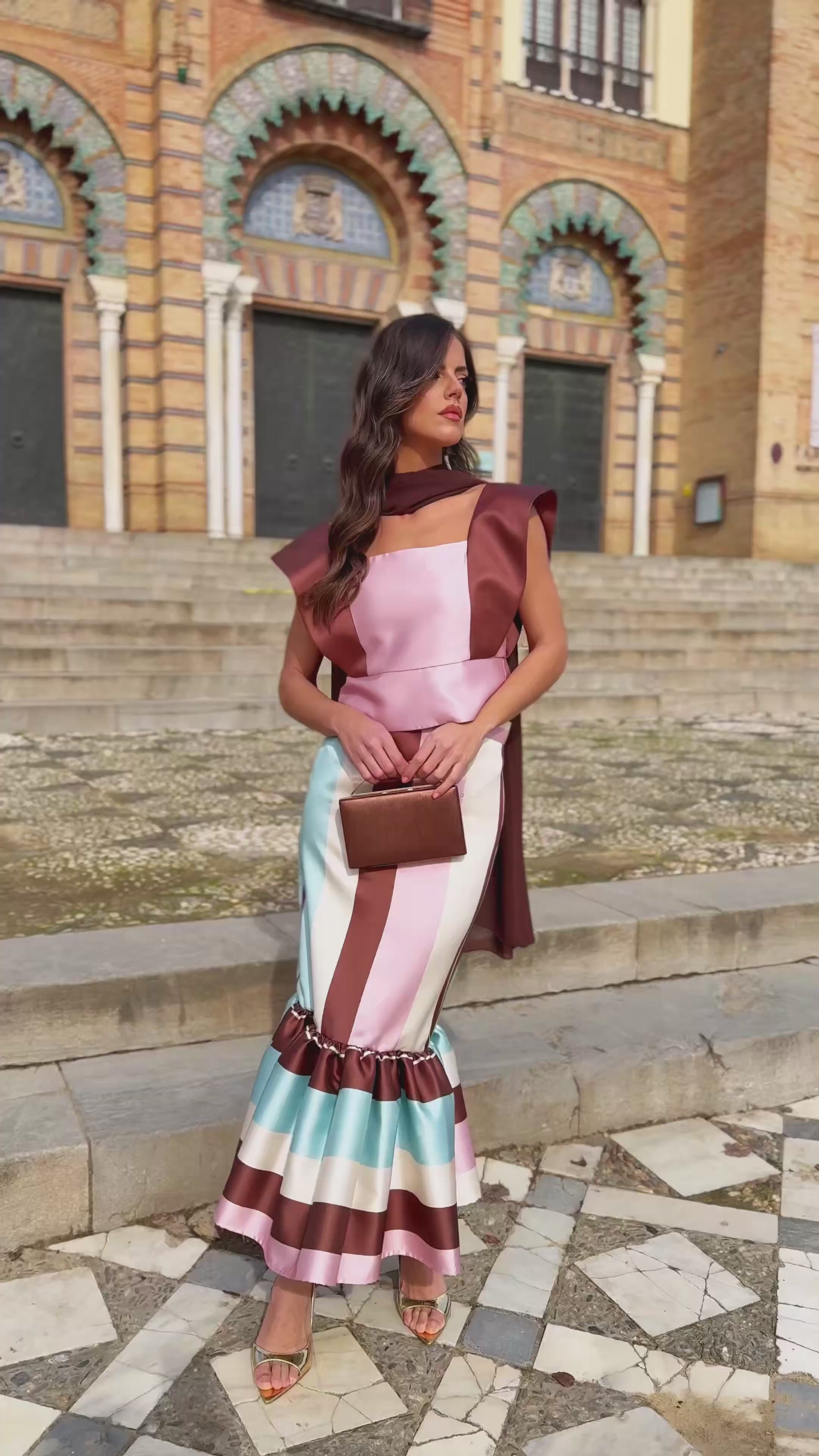 Este conjunto es la elección ideal para mamás de bautizo y comunión. Su largo midi y su paleta de colores sofisticada cumplen perfectamente con el protocolo de eventos de día, ofreciendo un look refinado pero moderno que no pasará desapercibido.