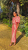 Confeccionado en un exquisito tafetán de acabado satinado, este dos piezas destaca por su estructura impecable y ese brillo sutil que captura la luz de forma única.