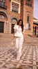 • Detalle: Botón joya central y pantalón de caída fluida.