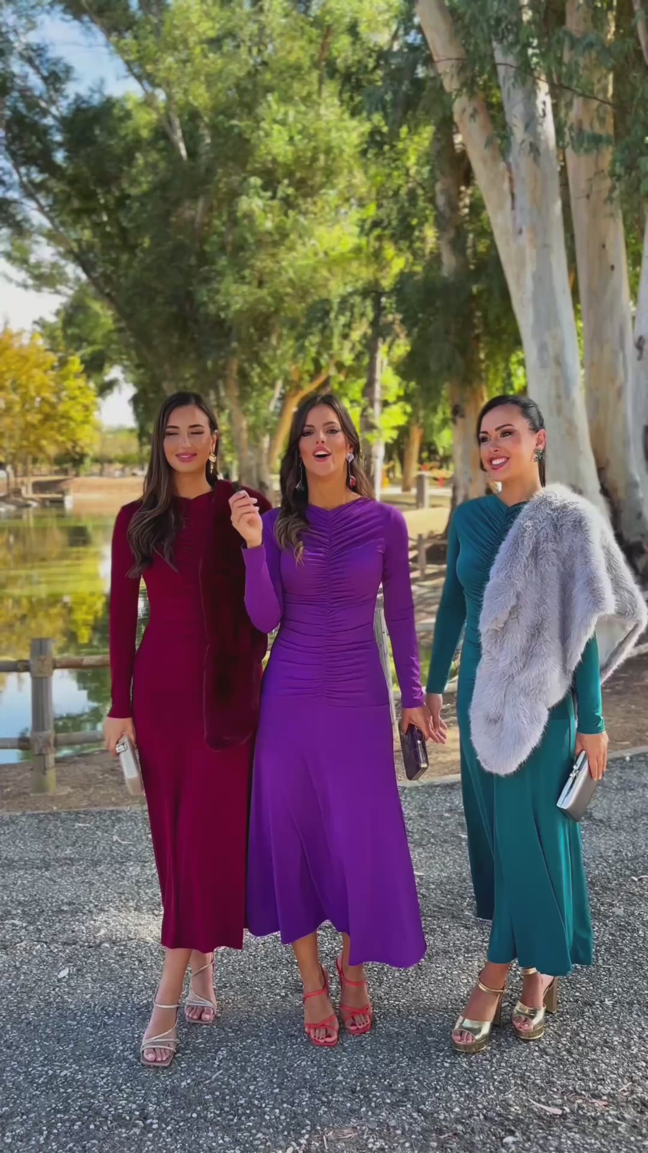 Vestido de festa elegante, com detalhe de franzido ao longo do vestido.